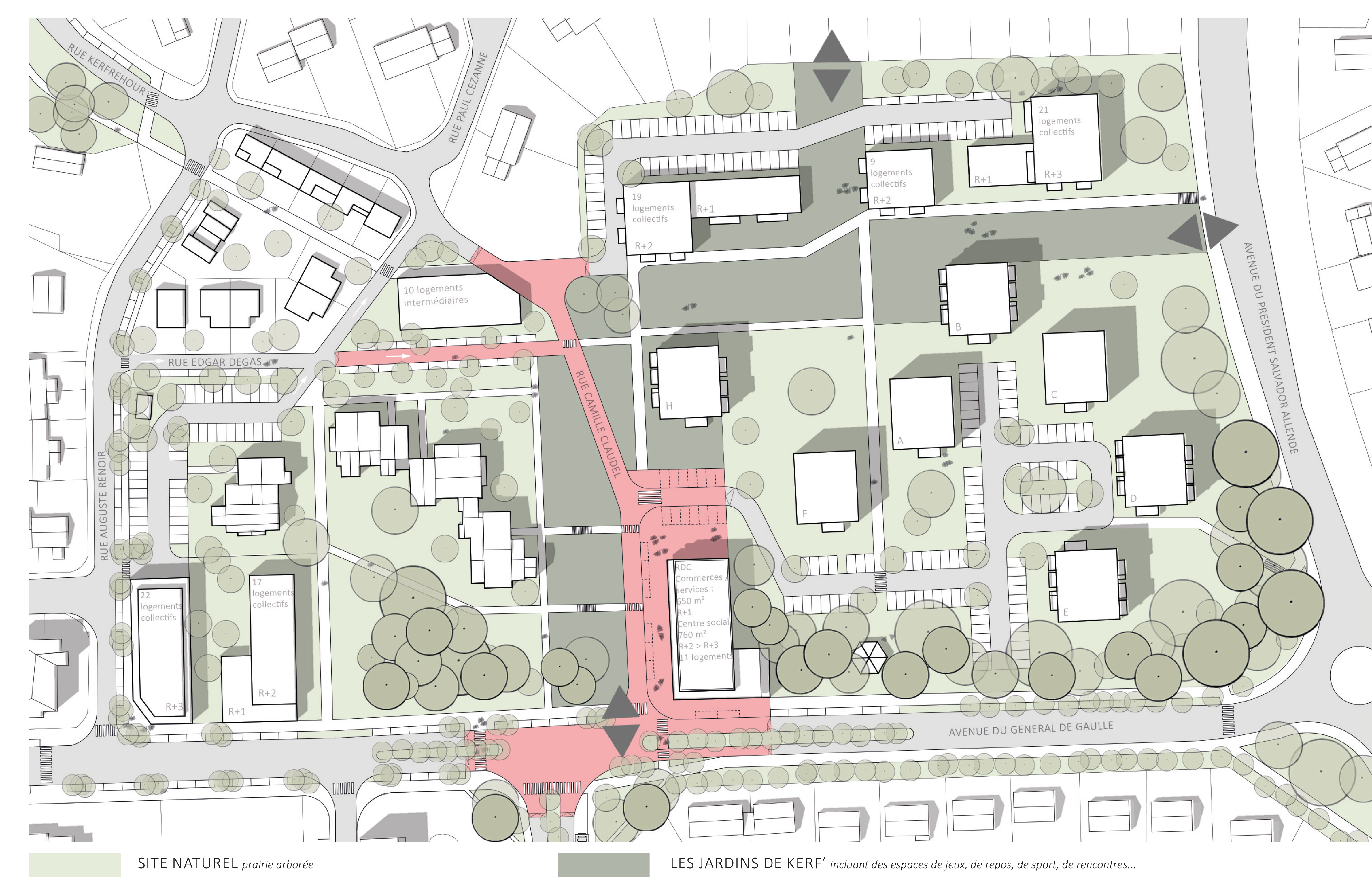 Le projet s'articule autour d'un axe central piétonnier et jardiné donnant droit sur le