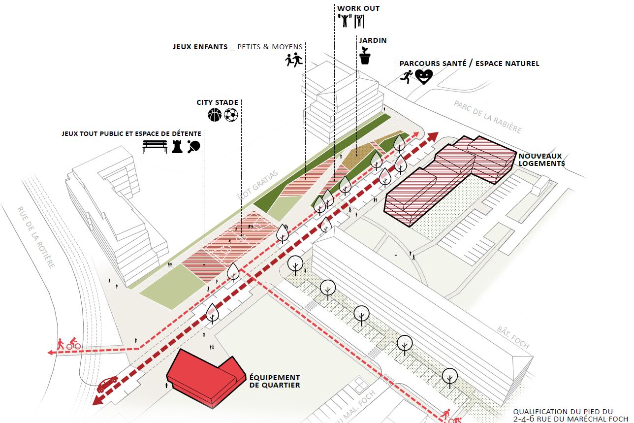 Le projet s'articule autour d'un axe central piétonnier et jardiné donnant droit sur le